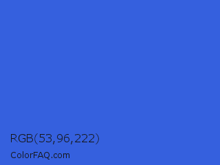 RGB 53,96,222 Color is a normal blue color and the nearest color is Royal Blue #4169e1. Hex code #3560de and RGB value is rgb(53,96,222). In RGB color space, this color is composed of 21% red, 38% green, 87% blue, In CMYK color space, this color is composed of 76% cyan, 57% magenta, 0% yellow , 13% black , In HSL color space, this color has a hue angle of 225° , 72% saturation and 54% lightness.