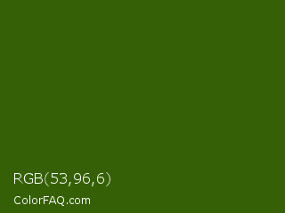 RGB 53,96,6 Color is a very dark green color and the nearest color is Dell #396413. Hex code #356006 and RGB value is rgb(53,96,6). In RGB color space, this color is composed of 21% red, 38% green, 2% blue, In CMYK color space, this color is composed of 45% cyan, 0% magenta, 94% yellow , 62% black , In HSL color space, this color has a hue angle of 89° , 88% saturation and 20% lightness.