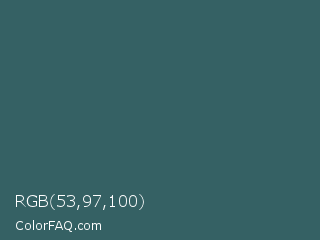 RGB 53,97,100 Color is a dark cyan color and the nearest color is Casal #2f6168. Hex code #356164 and RGB value is rgb(53,97,100). In RGB color space, this color is composed of 21% red, 38% green, 39% blue, In CMYK color space, this color is composed of 47% cyan, 3% magenta, 0% yellow , 61% black , In HSL color space, this color has a hue angle of 184° , 31% saturation and 30% lightness.