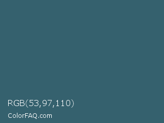 RGB 53,97,110 Color is a normal blue color and the nearest color is Casal #2f6168. Hex code #35616e and RGB value is rgb(53,97,110). In RGB color space, this color is composed of 21% red, 38% green, 43% blue, In CMYK color space, this color is composed of 52% cyan, 12% magenta, 0% yellow , 57% black , In HSL color space, this color has a hue angle of 194° , 35% saturation and 32% lightness.