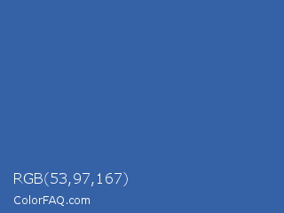 RGB 53,97,167 Color is a normal blue color and the nearest color is Azure #315ba1. Hex code #3561a7 and RGB value is rgb(53,97,167). In RGB color space, this color is composed of 21% red, 38% green, 65% blue, In CMYK color space, this color is composed of 68% cyan, 42% magenta, 0% yellow , 35% black , In HSL color space, this color has a hue angle of 217° , 52% saturation and 43% lightness.