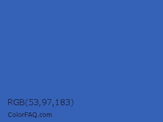 RGB 53,97,183 Color is a normal blue color and the nearest color is Cerulean Blue #2a52be. Hex code #3561b7 and RGB value is rgb(53,97,183). In RGB color space, this color is composed of 21% red, 38% green, 72% blue, In CMYK color space, this color is composed of 71% cyan, 47% magenta, 0% yellow , 28% black , In HSL color space, this color has a hue angle of 220° , 55% saturation and 46% lightness.
