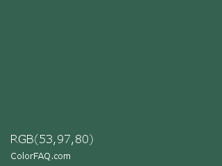 RGB 53,97,80 Color is a dark green color and the nearest color is Stromboli #325d52. Hex code #356150 and RGB value is rgb(53,97,80). In RGB color space, this color is composed of 21% red, 38% green, 31% blue, In CMYK color space, this color is composed of 45% cyan, 0% magenta, 18% yellow , 62% black , In HSL color space, this color has a hue angle of 157° , 29% saturation and 29% lightness.