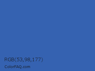 RGB 53,98,177 Color is a normal blue color and the nearest color is Azure #315ba1. Hex code #3562b1 and RGB value is rgb(53,98,177). In RGB color space, this color is composed of 21% red, 38% green, 69% blue, In CMYK color space, this color is composed of 70% cyan, 45% magenta, 0% yellow , 31% black , In HSL color space, this color has a hue angle of 218° , 54% saturation and 45% lightness.