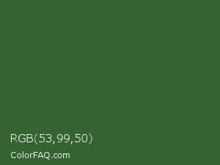RGB 53,99,50 Color is a dark green color and the nearest color is Mughal Green #306030. Hex code #356332 and RGB value is rgb(53,99,50). In RGB color space, this color is composed of 21% red, 39% green, 20% blue, In CMYK color space, this color is composed of 46% cyan, 0% magenta, 49% yellow , 61% black , In HSL color space, this color has a hue angle of 116° , 33% saturation and 29% lightness.