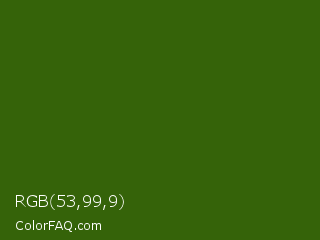 RGB 53,99,9 Color is a very dark green color and the nearest color is Dell #396413. Hex code #356309 and RGB value is rgb(53,99,9). In RGB color space, this color is composed of 21% red, 39% green, 4% blue, In CMYK color space, this color is composed of 46% cyan, 0% magenta, 91% yellow , 61% black , In HSL color space, this color has a hue angle of 91° , 83% saturation and 21% lightness.
