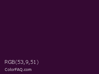 RGB 53,9,51 Color is a very dark magenta color and the nearest color is Mardi Gras #350036. Hex code #350933 and RGB value is rgb(53,9,51). In RGB color space, this color is composed of 21% red, 4% green, 20% blue, In CMYK color space, this color is composed of 0% cyan, 83% magenta, 4% yellow , 79% black , In HSL color space, this color has a hue angle of 303° , 71% saturation and 12% lightness.