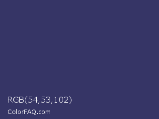 RGB 54,53,102 Color is a dark indigo color and the nearest color is Deep Koamaru #333366. Hex code #363566 and RGB value is rgb(54,53,102). In RGB color space, this color is composed of 21% red, 21% green, 40% blue, In CMYK color space, this color is composed of 47% cyan, 48% magenta, 0% yellow , 60% black , In HSL color space, this color has a hue angle of 241° , 32% saturation and 30% lightness.