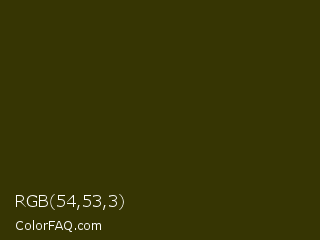 RGB 54,53,3 Color is a very dark yellow color and the nearest color is Madras #3f3002. Hex code #363503 and RGB value is rgb(54,53,3). In RGB color space, this color is composed of 21% red, 21% green, 1% blue, In CMYK color space, this color is composed of 0% cyan, 2% magenta, 94% yellow , 79% black , In HSL color space, this color has a hue angle of 59° , 89% saturation and 11% lightness.