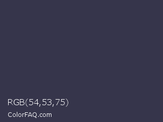 RGB 54,53,75 Color is a dark indigo color and the nearest color is Martinique #363050. Hex code #36354b and RGB value is rgb(54,53,75). In RGB color space, this color is composed of 21% red, 21% green, 29% blue, In CMYK color space, this color is composed of 28% cyan, 29% magenta, 0% yellow , 71% black , In HSL color space, this color has a hue angle of 243° , 17% saturation and 25% lightness.