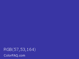 RGB 57,53,164 Color is a normal indigo color and the nearest color is Blue Pigment #333399. Hex code #3935a4 and RGB value is rgb(57,53,164). In RGB color space, this color is composed of 22% red, 21% green, 64% blue, In CMYK color space, this color is composed of 65% cyan, 68% magenta, 0% yellow , 36% black , In HSL color space, this color has a hue angle of 242° , 51% saturation and 43% lightness.