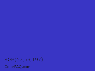 RGB 57,53,197 Color is a normal indigo color and the nearest color is Governor Bay #2f3cb3. Hex code #3935c5 and RGB value is rgb(57,53,197). In RGB color space, this color is composed of 22% red, 21% green, 77% blue, In CMYK color space, this color is composed of 71% cyan, 73% magenta, 0% yellow , 23% black , In HSL color space, this color has a hue angle of 242° , 58% saturation and 49% lightness.