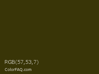 RGB 57,53,7 Color is a very dark yellow color and the nearest color is Madras #3f3002. Hex code #393507 and RGB value is rgb(57,53,7). In RGB color space, this color is composed of 22% red, 21% green, 3% blue, In CMYK color space, this color is composed of 0% cyan, 7% magenta, 88% yellow , 78% black , In HSL color space, this color has a hue angle of 55° , 78% saturation and 13% lightness.