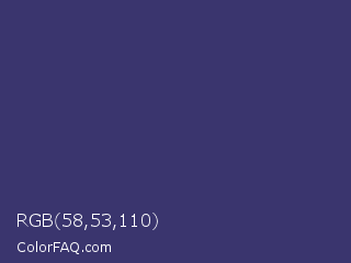 RGB 58,53,110 Color is a normal indigo color and the nearest color is Deep Koamaru #333366. Hex code #3a356e and RGB value is rgb(58,53,110). In RGB color space, this color is composed of 23% red, 21% green, 43% blue, In CMYK color space, this color is composed of 47% cyan, 52% magenta, 0% yellow , 57% black , In HSL color space, this color has a hue angle of 245° , 35% saturation and 32% lightness.