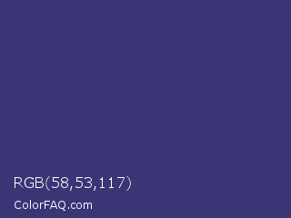 RGB 58,53,117 Color is a normal indigo color and the nearest color is Minsk #3f307f. Hex code #3a3575 and RGB value is rgb(58,53,117). In RGB color space, this color is composed of 23% red, 21% green, 46% blue, In CMYK color space, this color is composed of 50% cyan, 55% magenta, 0% yellow , 54% black , In HSL color space, this color has a hue angle of 245° , 38% saturation and 33% lightness.