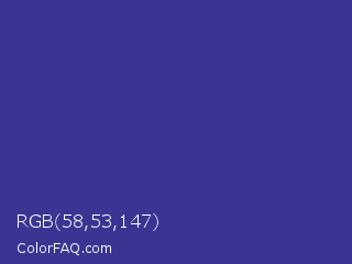 RGB 58,53,147 Color is a normal indigo color and the nearest color is Blue Pigment #333399. Hex code #3a3593 and RGB value is rgb(58,53,147). In RGB color space, this color is composed of 23% red, 21% green, 58% blue, In CMYK color space, this color is composed of 61% cyan, 64% magenta, 0% yellow , 42% black , In HSL color space, this color has a hue angle of 243° , 47% saturation and 39% lightness.