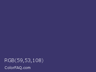 RGB 59,53,108 Color is a normal indigo color and the nearest color is Deep Koamaru #333366. Hex code #3b356c and RGB value is rgb(59,53,108). In RGB color space, this color is composed of 23% red, 21% green, 42% blue, In CMYK color space, this color is composed of 45% cyan, 51% magenta, 0% yellow , 58% black , In HSL color space, this color has a hue angle of 247° , 34% saturation and 32% lightness.