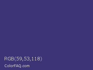 RGB 59,53,118 Color is a normal indigo color and the nearest color is Minsk #3f307f. Hex code #3b3576 and RGB value is rgb(59,53,118). In RGB color space, this color is composed of 23% red, 21% green, 46% blue, In CMYK color space, this color is composed of 50% cyan, 55% magenta, 0% yellow , 54% black , In HSL color space, this color has a hue angle of 246° , 38% saturation and 34% lightness.