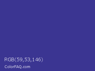 RGB 59,53,146 Color is a normal indigo color and the nearest color is Blue Pigment #333399. Hex code #3b3592 and RGB value is rgb(59,53,146). In RGB color space, this color is composed of 23% red, 21% green, 57% blue, In CMYK color space, this color is composed of 60% cyan, 64% magenta, 0% yellow , 43% black , In HSL color space, this color has a hue angle of 244° , 47% saturation and 39% lightness.