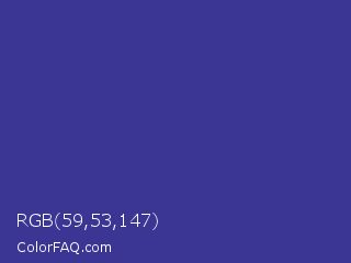 RGB 59,53,147 Color is a normal indigo color and the nearest color is Blue Pigment #333399. Hex code #3b3593 and RGB value is rgb(59,53,147). In RGB color space, this color is composed of 23% red, 21% green, 58% blue, In CMYK color space, this color is composed of 60% cyan, 64% magenta, 0% yellow , 42% black , In HSL color space, this color has a hue angle of 244° , 47% saturation and 39% lightness.