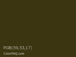RGB 59,53,17 Color is a very dark yellow color and the nearest color is Camouflage #3c3910. Hex code #3b3511 and RGB value is rgb(59,53,17). In RGB color space, this color is composed of 23% red, 21% green, 7% blue, In CMYK color space, this color is composed of 0% cyan, 10% magenta, 71% yellow , 77% black , In HSL color space, this color has a hue angle of 51° , 55% saturation and 15% lightness.