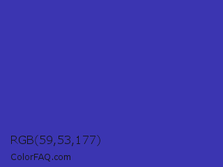 RGB 59,53,177 Color is a normal indigo color and the nearest color is Governor Bay #2f3cb3. Hex code #3b35b1 and RGB value is rgb(59,53,177). In RGB color space, this color is composed of 23% red, 21% green, 69% blue, In CMYK color space, this color is composed of 67% cyan, 70% magenta, 0% yellow , 31% black , In HSL color space, this color has a hue angle of 243° , 54% saturation and 45% lightness.