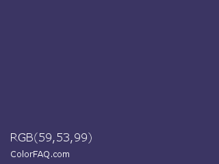 RGB 59,53,99 Color is a dark indigo color and the nearest color is Deep Koamaru #333366. Hex code #3b3563 and RGB value is rgb(59,53,99). In RGB color space, this color is composed of 23% red, 21% green, 39% blue, In CMYK color space, this color is composed of 40% cyan, 46% magenta, 0% yellow , 61% black , In HSL color space, this color has a hue angle of 248° , 30% saturation and 30% lightness.