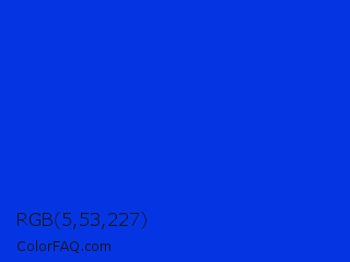 RGB 5,53,227 Color is a normal blue color and the nearest color is Blue RYB #0247fe. Hex code #0535e3 and RGB value is rgb(5,53,227). In RGB color space, this color is composed of 2% red, 21% green, 89% blue, In CMYK color space, this color is composed of 98% cyan, 77% magenta, 0% yellow , 11% black , In HSL color space, this color has a hue angle of 227° , 96% saturation and 45% lightness.