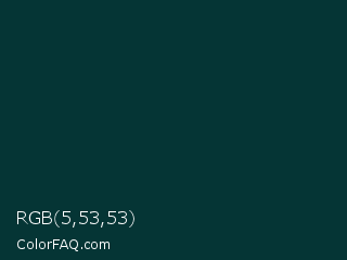 RGB 5,53,53 Color is a very dark cyan color and the nearest color is Tiber #063537. Hex code #053535 and RGB value is rgb(5,53,53). In RGB color space, this color is composed of 2% red, 21% green, 21% blue, In CMYK color space, this color is composed of 91% cyan, 0% magenta, 0% yellow , 79% black , In HSL color space, this color has a hue angle of 180° , 83% saturation and 11% lightness.