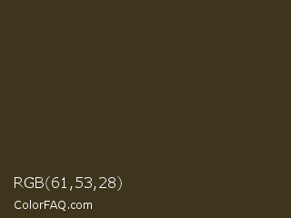 RGB 61,53,28 Color is a very dark orange color and the nearest color is Pullman Green #3b331c. Hex code #3d351c and RGB value is rgb(61,53,28). In RGB color space, this color is composed of 24% red, 21% green, 11% blue, In CMYK color space, this color is composed of 0% cyan, 13% magenta, 54% yellow , 76% black , In HSL color space, this color has a hue angle of 45° , 37% saturation and 17% lightness.