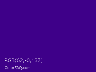 RGB 62,-0,137 Color is a dark violet color and the nearest color is Kingfisher Daisy #3e0480. Hex code #3e0089 and RGB value is rgb(62,-0,137). In RGB color space, this color is composed of 24% red, 0% green, 54% blue, In CMYK color space, this color is composed of 55% cyan, 100% magenta, 0% yellow , 46% black , In HSL color space, this color has a hue angle of 267° , 100% saturation and 27% lightness.