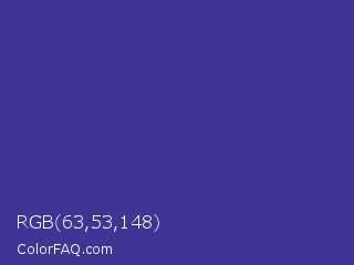 RGB 63,53,148 Color is a normal indigo color and the nearest color is Blue Pigment #333399. Hex code #3f3594 and RGB value is rgb(63,53,148). In RGB color space, this color is composed of 25% red, 21% green, 58% blue, In CMYK color space, this color is composed of 57% cyan, 64% magenta, 0% yellow , 42% black , In HSL color space, this color has a hue angle of 246° , 47% saturation and 39% lightness.