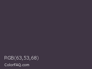 RGB 63,53,68 Color is a dark purple color and the nearest color is Ship Gray #3e3a44. Hex code #3f3544 and RGB value is rgb(63,53,68). In RGB color space, this color is composed of 25% red, 21% green, 27% blue, In CMYK color space, this color is composed of 7% cyan, 22% magenta, 0% yellow , 73% black , In HSL color space, this color has a hue angle of 280° , 12% saturation and 24% lightness.