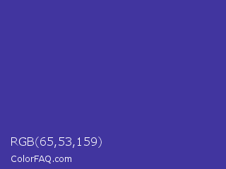 RGB 65,53,159 Color is a normal indigo color and the nearest color is Blue Pigment #333399. Hex code #41359f and RGB value is rgb(65,53,159). In RGB color space, this color is composed of 25% red, 21% green, 62% blue, In CMYK color space, this color is composed of 59% cyan, 67% magenta, 0% yellow , 38% black , In HSL color space, this color has a hue angle of 247° , 50% saturation and 42% lightness.