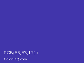 RGB 65,53,171 Color is a normal indigo color and the nearest color is Governor Bay #2f3cb3. Hex code #4135ab and RGB value is rgb(65,53,171). In RGB color space, this color is composed of 25% red, 21% green, 67% blue, In CMYK color space, this color is composed of 62% cyan, 69% magenta, 0% yellow , 33% black , In HSL color space, this color has a hue angle of 246° , 53% saturation and 44% lightness.