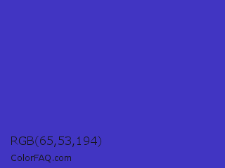 RGB 65,53,194 Color is a normal indigo color and the nearest color is Ocean Blue #4f42b5. Hex code #4135c2 and RGB value is rgb(65,53,194). In RGB color space, this color is composed of 25% red, 21% green, 76% blue, In CMYK color space, this color is composed of 66% cyan, 73% magenta, 0% yellow , 24% black , In HSL color space, this color has a hue angle of 245° , 57% saturation and 48% lightness.