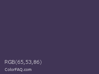 RGB 65,53,86 Color is a dark violet color and the nearest color is Gun Powder #414257. Hex code #413556 and RGB value is rgb(65,53,86). In RGB color space, this color is composed of 25% red, 21% green, 34% blue, In CMYK color space, this color is composed of 24% cyan, 38% magenta, 0% yellow , 66% black , In HSL color space, this color has a hue angle of 262° , 24% saturation and 27% lightness.