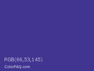RGB 66,53,145 Color is a normal indigo color and the nearest color is Dark Slate Blue #483d8b. Hex code #423591 and RGB value is rgb(66,53,145). In RGB color space, this color is composed of 26% red, 21% green, 57% blue, In CMYK color space, this color is composed of 54% cyan, 63% magenta, 0% yellow , 43% black , In HSL color space, this color has a hue angle of 248° , 46% saturation and 39% lightness.