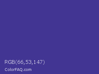 RGB 66,53,147 Color is a normal indigo color and the nearest color is Dark Slate Blue #483d8b. Hex code #423593 and RGB value is rgb(66,53,147). In RGB color space, this color is composed of 26% red, 21% green, 58% blue, In CMYK color space, this color is composed of 55% cyan, 64% magenta, 0% yellow , 42% black , In HSL color space, this color has a hue angle of 248° , 47% saturation and 39% lightness.