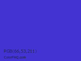 RGB 66,53,211 Color is a normal indigo color and the nearest color is Palatinate Blue #273be2. Hex code #4235d3 and RGB value is rgb(66,53,211). In RGB color space, this color is composed of 26% red, 21% green, 83% blue, In CMYK color space, this color is composed of 69% cyan, 75% magenta, 0% yellow , 17% black , In HSL color space, this color has a hue angle of 245° , 64% saturation and 52% lightness.