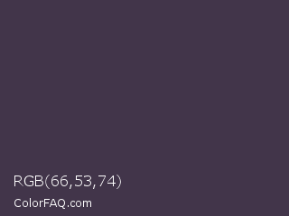 RGB 66,53,74 Color is a dark purple color and the nearest color is Ship Gray #3e3a44. Hex code #42354a and RGB value is rgb(66,53,74). In RGB color space, this color is composed of 26% red, 21% green, 29% blue, In CMYK color space, this color is composed of 11% cyan, 28% magenta, 0% yellow , 71% black , In HSL color space, this color has a hue angle of 277° , 17% saturation and 25% lightness.