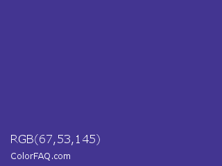 RGB 67,53,145 Color is a normal indigo color and the nearest color is Dark Slate Blue #483d8b. Hex code #433591 and RGB value is rgb(67,53,145). In RGB color space, this color is composed of 26% red, 21% green, 57% blue, In CMYK color space, this color is composed of 54% cyan, 63% magenta, 0% yellow , 43% black , In HSL color space, this color has a hue angle of 249° , 46% saturation and 39% lightness.