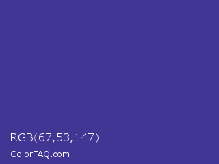 RGB 67,53,147 Color is a normal indigo color and the nearest color is Dark Slate Blue #483d8b. Hex code #433593 and RGB value is rgb(67,53,147). In RGB color space, this color is composed of 26% red, 21% green, 58% blue, In CMYK color space, this color is composed of 54% cyan, 64% magenta, 0% yellow , 42% black , In HSL color space, this color has a hue angle of 249° , 47% saturation and 39% lightness.