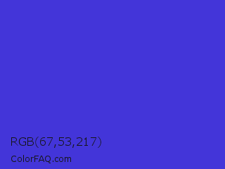 RGB 67,53,217 Color is a normal indigo color and the nearest color is Palatinate Blue #273be2. Hex code #4335d9 and RGB value is rgb(67,53,217). In RGB color space, this color is composed of 26% red, 21% green, 85% blue, In CMYK color space, this color is composed of 69% cyan, 76% magenta, 0% yellow , 15% black , In HSL color space, this color has a hue angle of 245° , 68% saturation and 53% lightness.