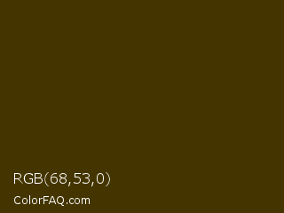 RGB 68,53,0 Color is a very dark yellow color and the nearest color is Madras #3f3002. Hex code #443500 and RGB value is rgb(68,53,0). In RGB color space, this color is composed of 27% red, 21% green, 0% blue, In CMYK color space, this color is composed of 0% cyan, 22% magenta, 100% yellow , 73% black , In HSL color space, this color has a hue angle of 47° , 100% saturation and 13% lightness.