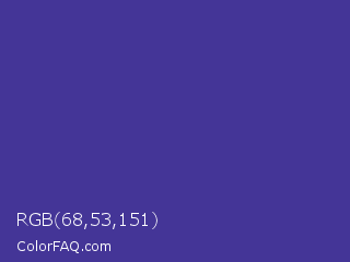 RGB 68,53,151 Color is a normal indigo color and the nearest color is Dark Slate Blue #483d8b. Hex code #443597 and RGB value is rgb(68,53,151). In RGB color space, this color is composed of 27% red, 21% green, 59% blue, In CMYK color space, this color is composed of 55% cyan, 65% magenta, 0% yellow , 41% black , In HSL color space, this color has a hue angle of 249° , 48% saturation and 40% lightness.