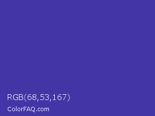 RGB 68,53,167 Color is a normal indigo color and the nearest color is Ocean Blue #4f42b5. Hex code #4435a7 and RGB value is rgb(68,53,167). In RGB color space, this color is composed of 27% red, 21% green, 65% blue, In CMYK color space, this color is composed of 59% cyan, 68% magenta, 0% yellow , 35% black , In HSL color space, this color has a hue angle of 248° , 52% saturation and 43% lightness.