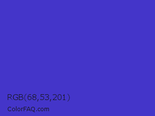 RGB 68,53,201 Color is a normal indigo color and the nearest color is Ocean Blue #4f42b5. Hex code #4435c9 and RGB value is rgb(68,53,201). In RGB color space, this color is composed of 27% red, 21% green, 79% blue, In CMYK color space, this color is composed of 66% cyan, 74% magenta, 0% yellow , 21% black , In HSL color space, this color has a hue angle of 246° , 58% saturation and 50% lightness.