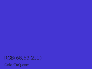RGB 68,53,211 Color is a normal indigo color and the nearest color is Palatinate Blue #273be2. Hex code #4435d3 and RGB value is rgb(68,53,211). In RGB color space, this color is composed of 27% red, 21% green, 83% blue, In CMYK color space, this color is composed of 68% cyan, 75% magenta, 0% yellow , 17% black , In HSL color space, this color has a hue angle of 246° , 64% saturation and 52% lightness.