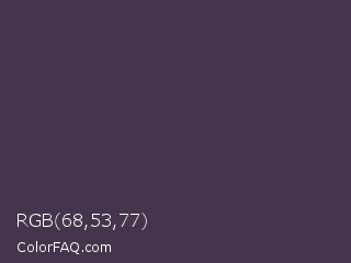 RGB 68,53,77 Color is a dark purple color and the nearest color is Ship Gray #3e3a44. Hex code #44354d and RGB value is rgb(68,53,77). In RGB color space, this color is composed of 27% red, 21% green, 30% blue, In CMYK color space, this color is composed of 12% cyan, 31% magenta, 0% yellow , 70% black , In HSL color space, this color has a hue angle of 278° , 18% saturation and 25% lightness.